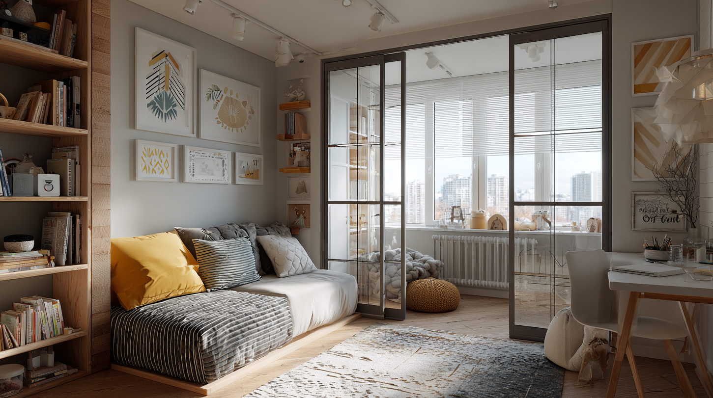 Один из самых популярных вариантов — разделить большую гостиную перегородкой, создав компактную спальню для ребенка. Используются гипсокартонные или стеклянные перегородки с хорошей шумоизоляцией. Если окно одно, важно продумать свет — можно установить стеклоблоки или зону с прозрачными вставками, чтобы дневной свет проходил в обе комнаты. В «Ремонтной группе» мы часто используем раздвижные системы и скрытые двери — они сохраняют визуальное пространство и делают интерьер современным.